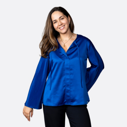 This rich sapphire blouse exudes elegance with its silky finish and flowing pleated sleeves for a touch of drama. Perfect for day-to-night styling, it combines luxurious texture with a flattering, relaxed silhouette.