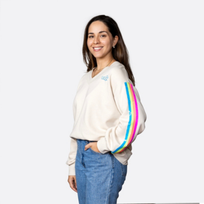 Elevate your outerwear with this cream sweatshirt accented with sequins striped on the sleeves. Designed for all-day comfort and flair, it’s a versatile piece you’ll love!