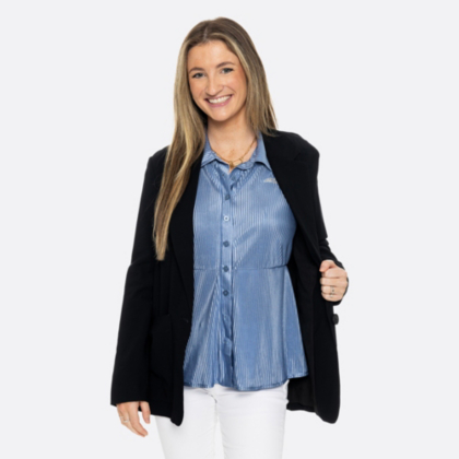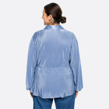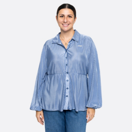 Shimmer & shine in this women's top! This dusty blue blouse features a satin crinkle material with gold embroidery and puff sleeves that make it totally unique.