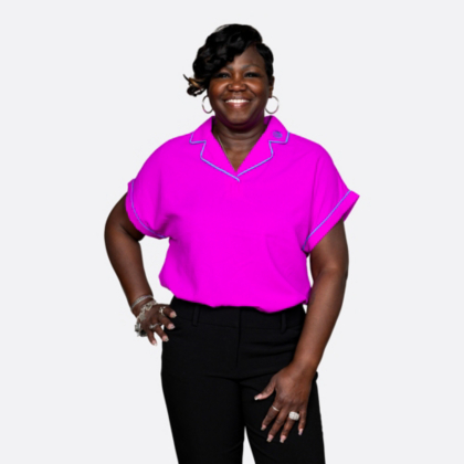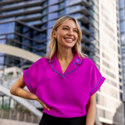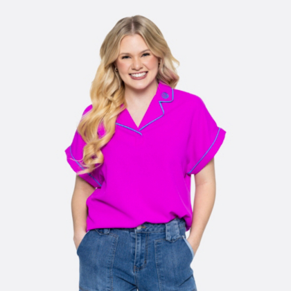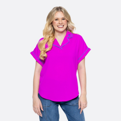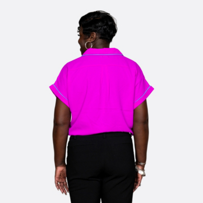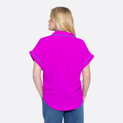 Stand out in style! This women's very berry blouse featured cuffed sleeves and contrast piping that make it stand out.