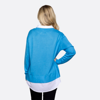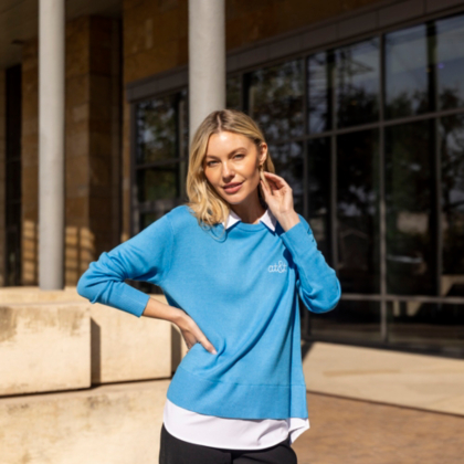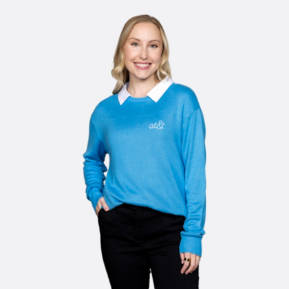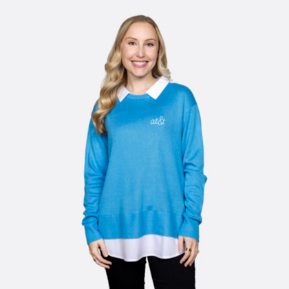 This women's sweater top features a built-in shirt tail and collar to give it a layered look. Perfect for a more dressed up look yet comfy feel. Finished with an embroidered script AT&T design.
