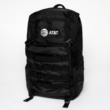- Black backpack feturing screen-print AT&T logo on front top