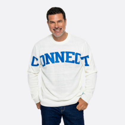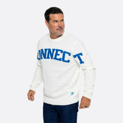Get connected this season with this fun sweater featuring bold embroidered felt lettering and an AT&T globe.