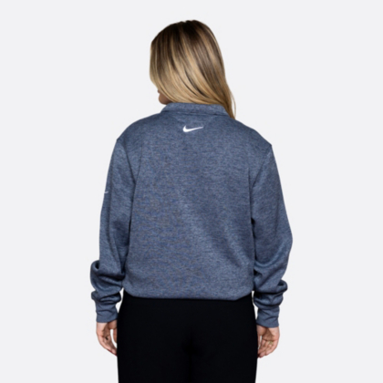 Nike has engineered a cover-up that looks and feels like your favorite sweater - but is ready to perform with Dri-Fit technology. Design details include a cadet collar, reverse coil zipper with faux leather zipper pull, rib knit cuffs and rib knit hem. A contrast Swoosh logo is embroidered on left sleeve and center back neck. Made of 8.3-ounce polyester Dri-Fit fabric.