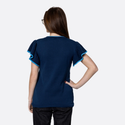 Elevate your everyday look with this chic top featuring playful flutter sleeves and vibrant blue trim for a pop of color. Crafted with both comfort and style in mind, it's perfect for any occasion.