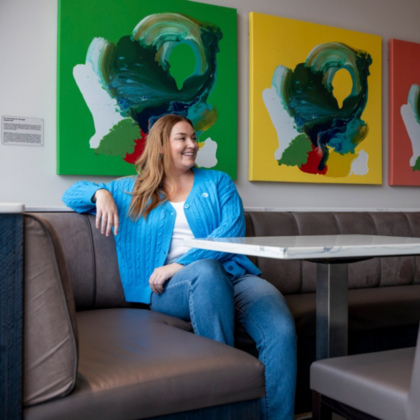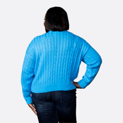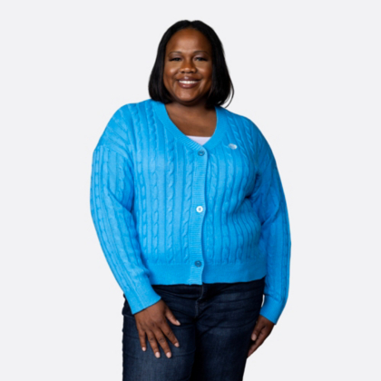 This AT&T blue cable knit women's cardigan is the perfect piece to keep you cozy at the office or out and about.