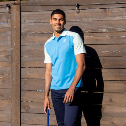 This two-tone men's polo is warm weather ready and transitions nicely from the conference room to the golf course.