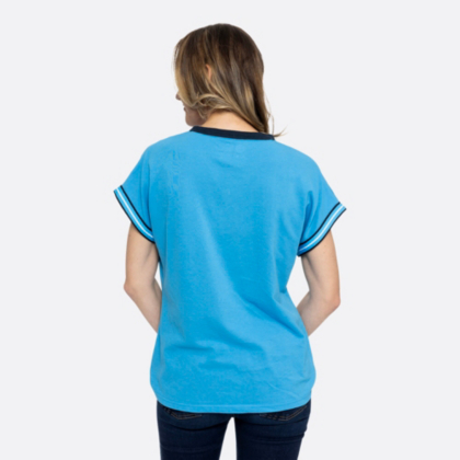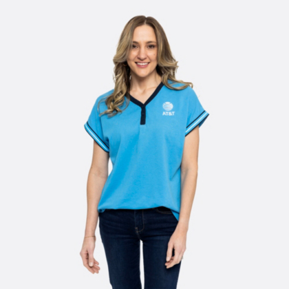 Look your best in blue with the Almeta. Made from a cozy pique fabric blend, this Henley features a classic 2-button placket, a fun contrast neckline, and playful stripe trims on the sleeves. With an embroidered AT&T globe logo on the chest and back neck, you will show up as the expert in the room.