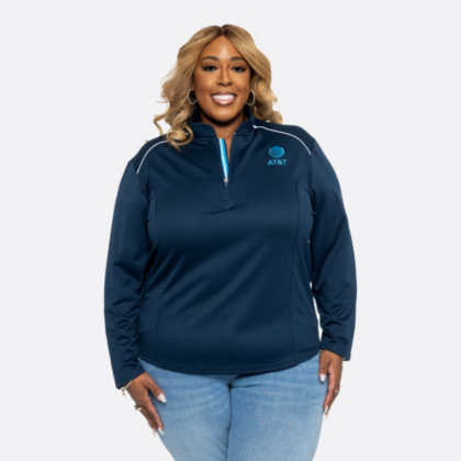 Zip into style with the Carrie - a flattering long sleeve quarter zip. Featuring an embroidered AT&T logo and modern contrast piping, it's the perfect blend of comfort and flair. Get ready to sport some AT&T spirit!