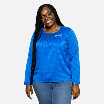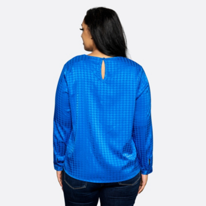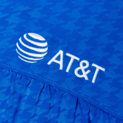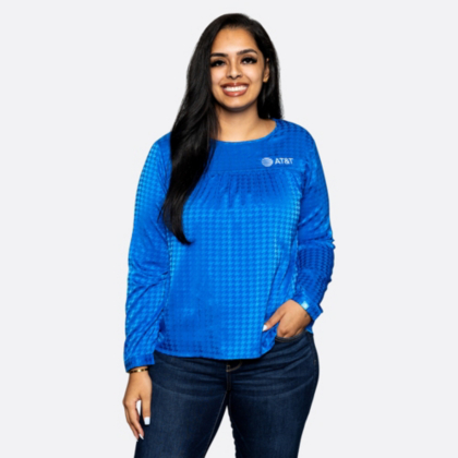 Introducing Millenia, the stunning blouse in a vibrant shade of blue. With a striking houndstooth pattern and beautifully embroidered AT&T logo, this top is ultra-flattering and perfect for making a statement.