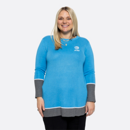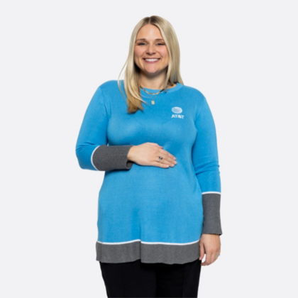 Stay stylish with the Tensley a lightweight long-sleeve boat neck sweater. It features a playful contrast hem and an embroidered AT&T globe. This sweater offers comfort without the bulk, making it perfect for layering or wearing on its own. Your go-to piece for casual chic! Designed to comfortably fit your growing baby bump.